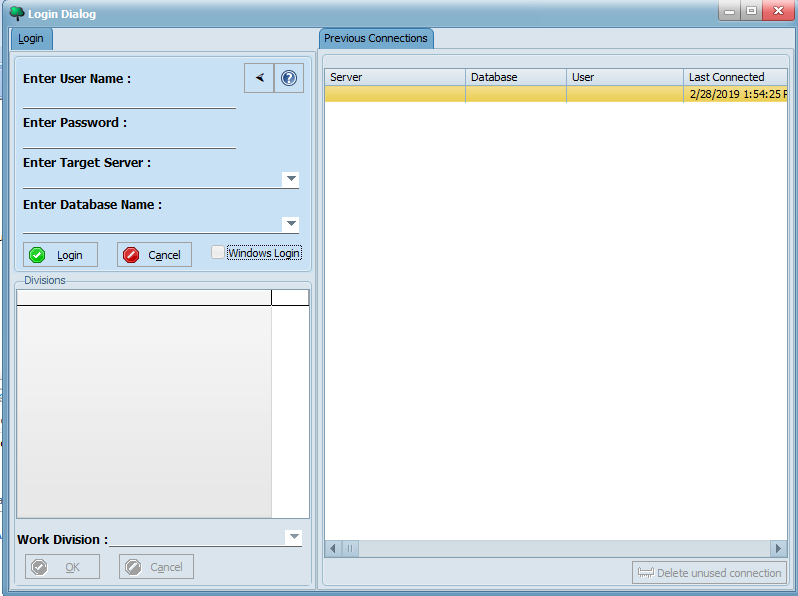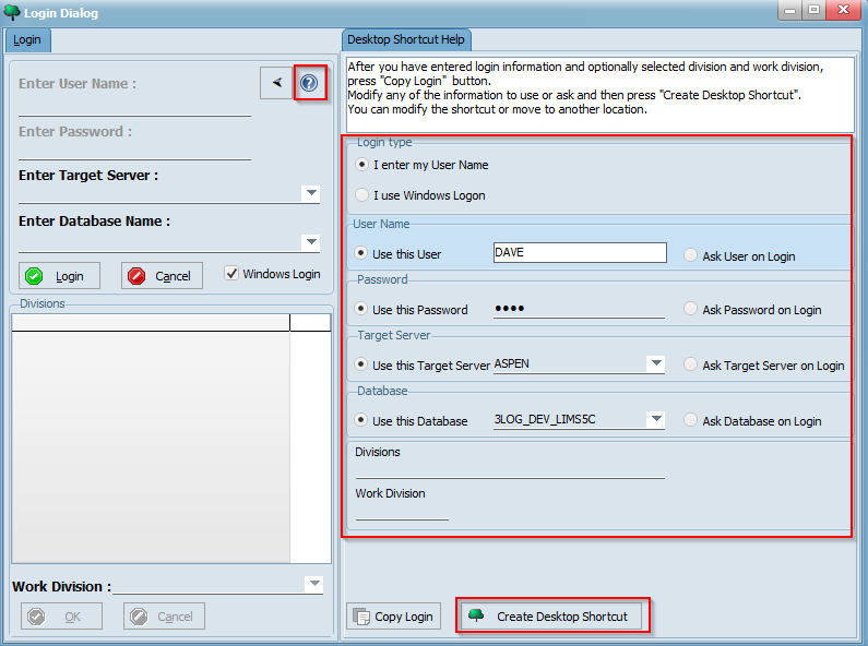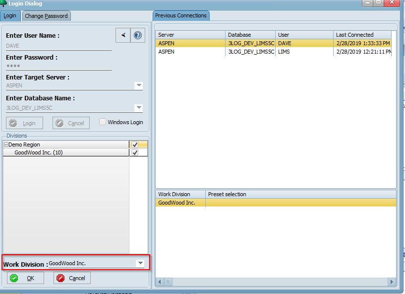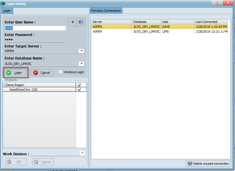 If your organization uses Windows authentication, ensure that the Windows Login option is checked (the Enter User Name and Enter Password field will then be disabled). Otherwise, enter the username and password provided by your LIMS administrator into the corresponding fields. Then, select or enter your LIMS server and database using the Enter Target Server and Enter Database fields. Now, click the Login button and select your division(s):