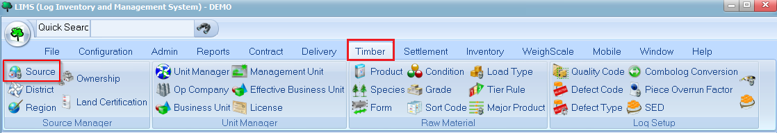 Alternatively, you may launch the Source screen by clicking on the Source button under the Timber menu: