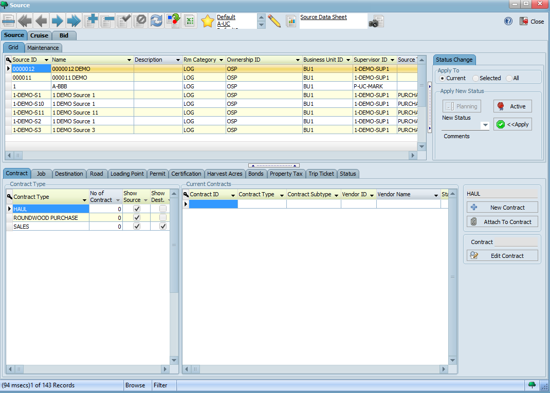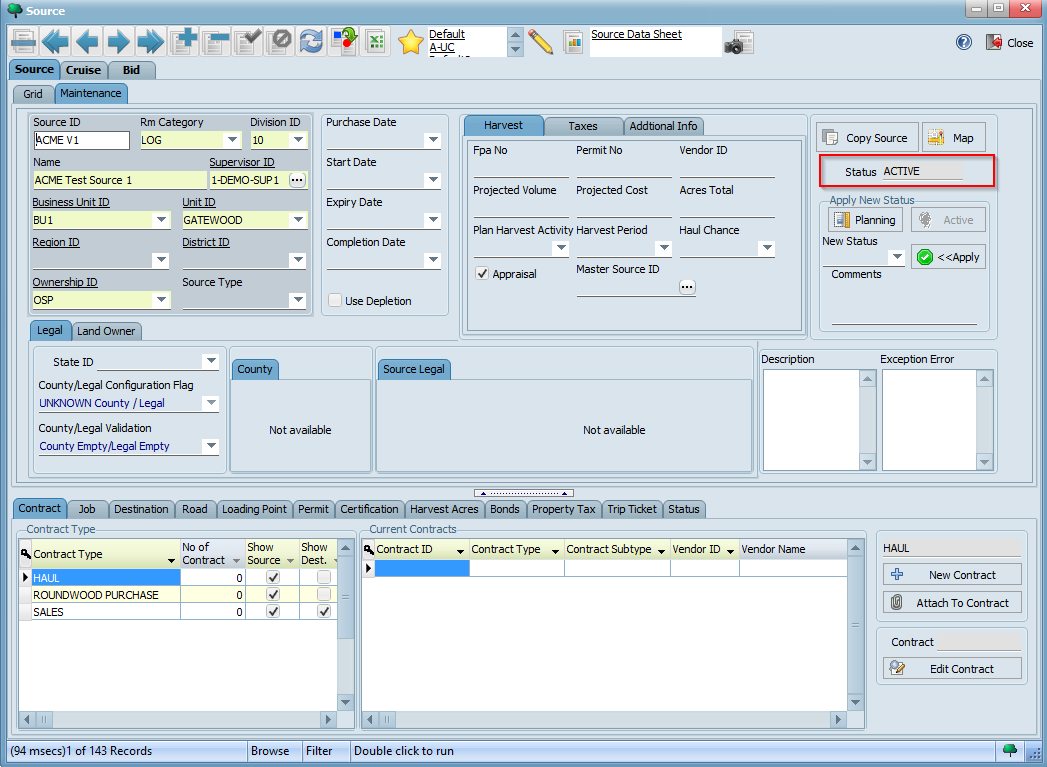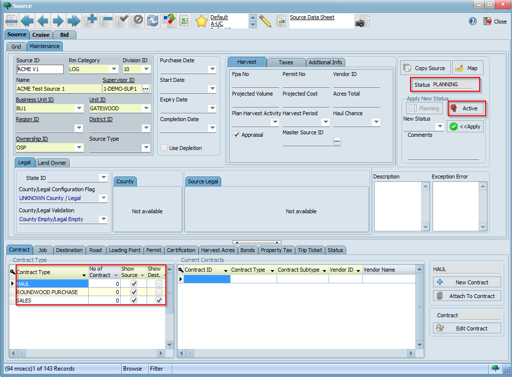 Click the button on the toolbar to save your changes. Observe how the available contract types for this source now appear on the bottom left hand corner. Note also that it is in PLANNING status by default. Click the ACTIVE button highlighted below to make it active: